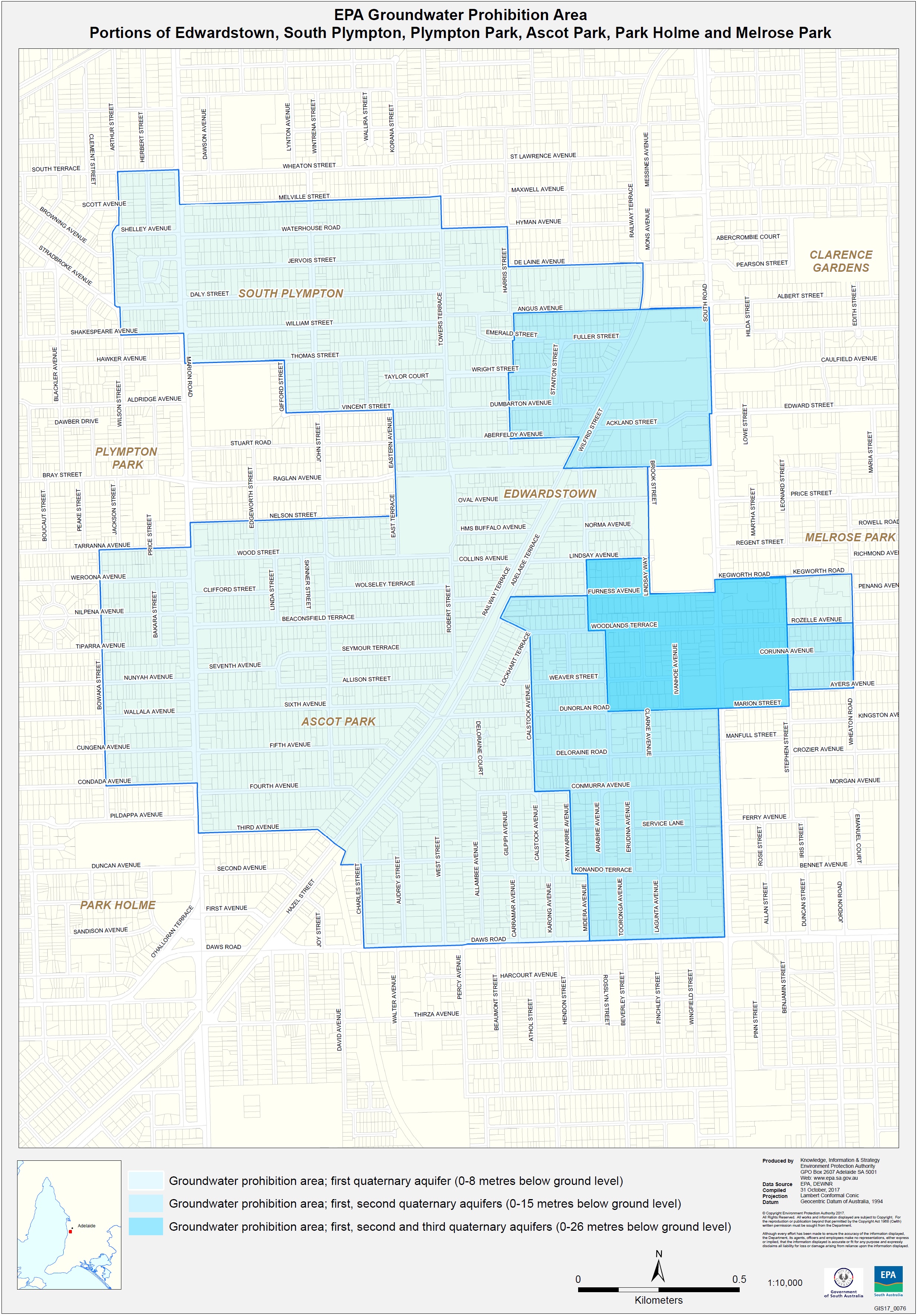 The EPA established a groundwater prohibition area in portions of Edwardstown, South Plympton, Plympton Park, Ascot Park, Park Holme, and Melrose Park. This prohibition on the extraction of groundwater was published in the South Australian Government Gazette on 9 January 2018.